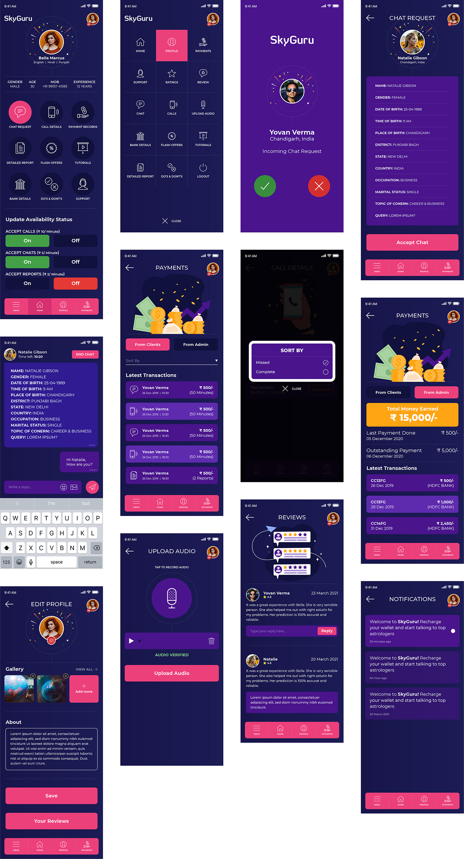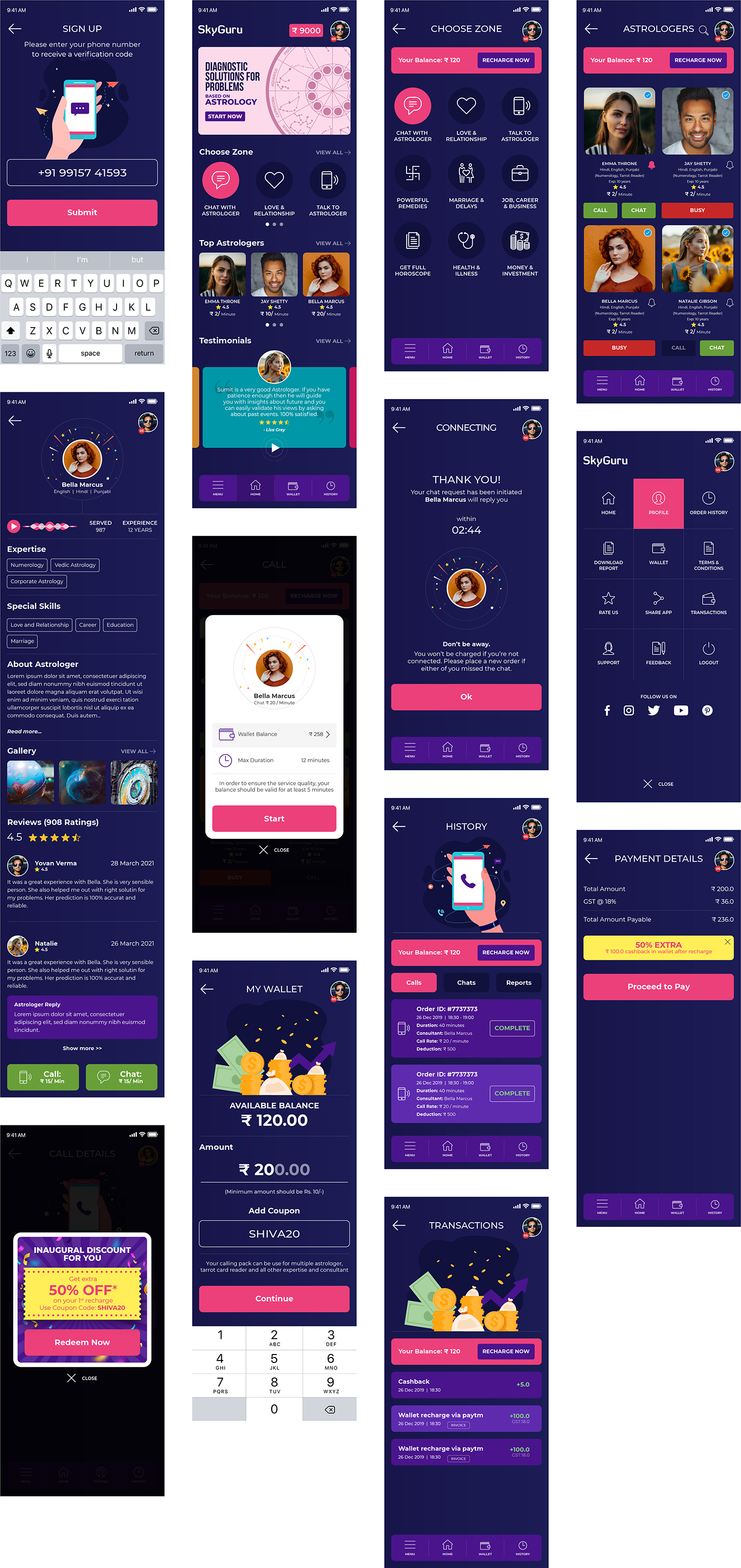 Over a video conference with the founder, it was stated that the app should be professionally designed, while being visually appearing and user-friendly The app must also encourage new registrations of users, astrologers and payment submissions with ease.